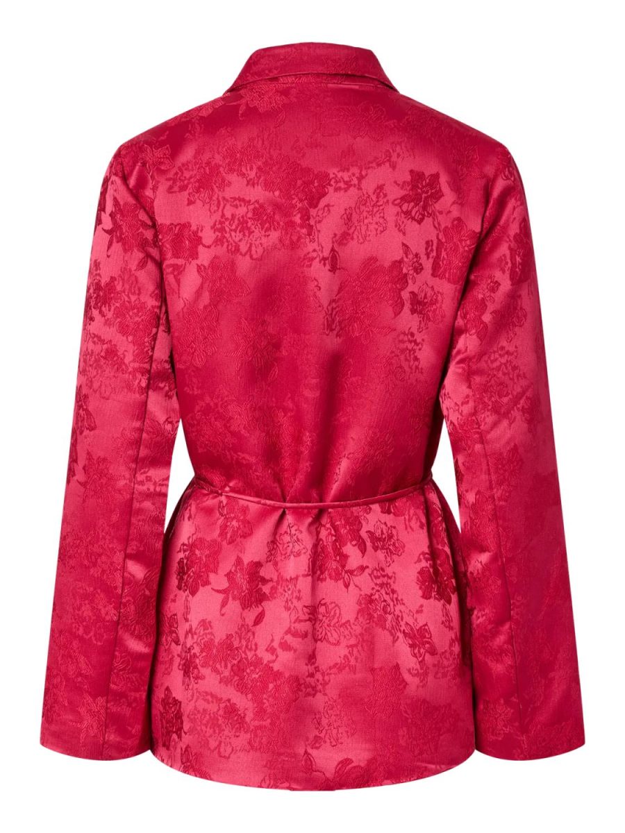 Stilig omslagsjakke i rødt med broderier, slag og knytting i livet.