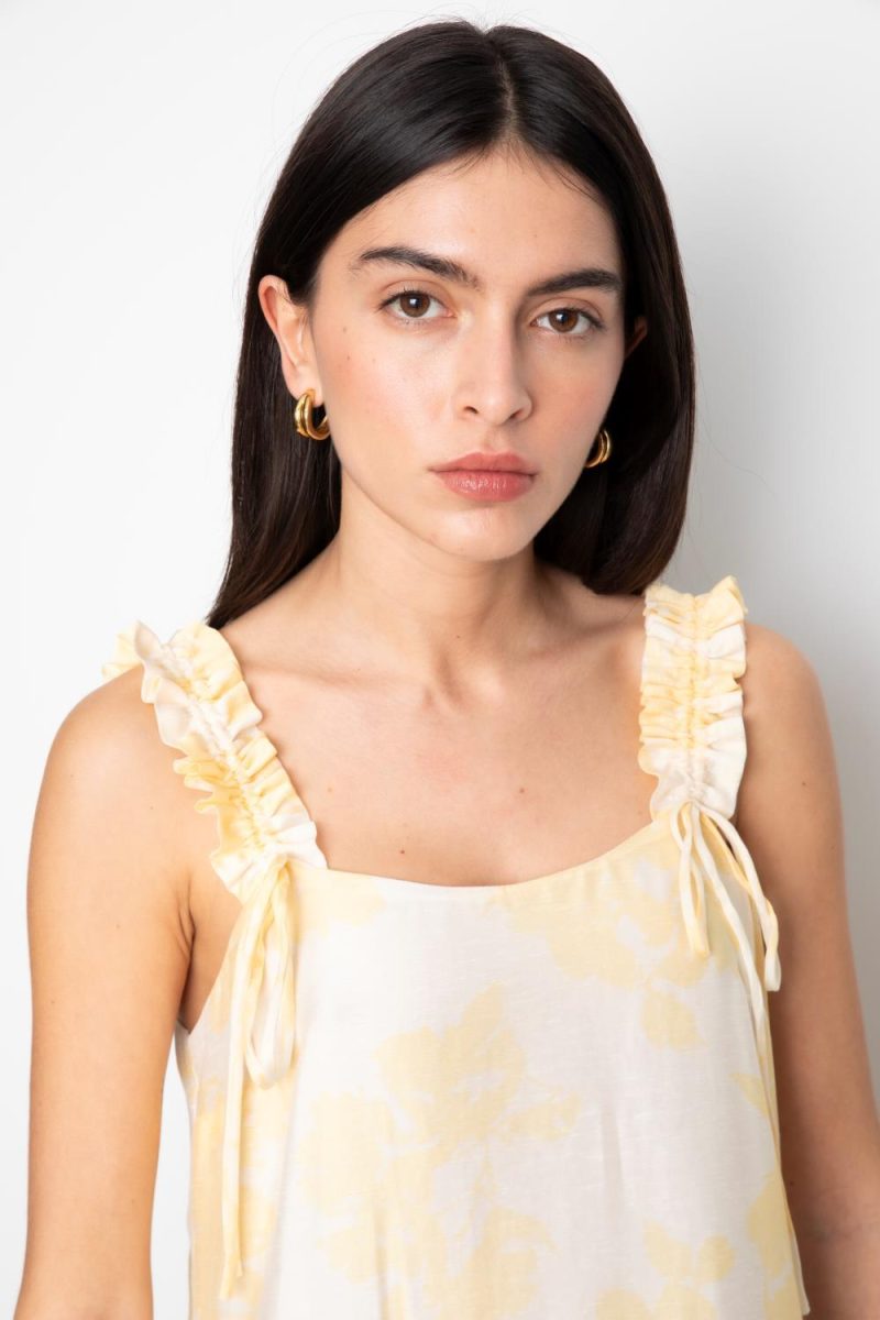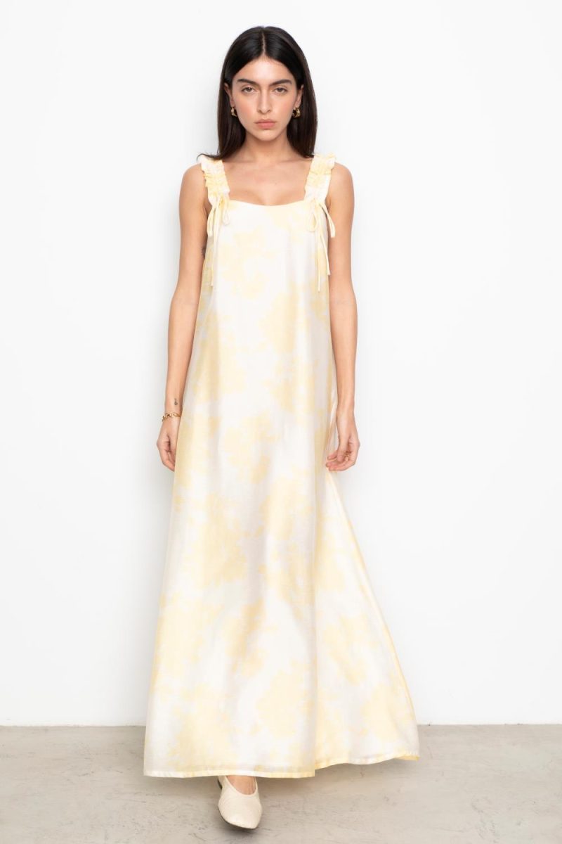 Zaha kjolen er laget av en myk Tencel-blanding og har justerbare skulderstropper samt et A-formet skjørt. Den kommer i vårt delikate, gule blomsterprint og gir en lett og feminin silhuett som passer perfekt for sesongen.